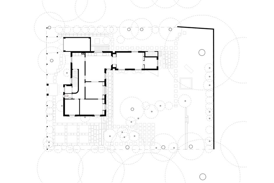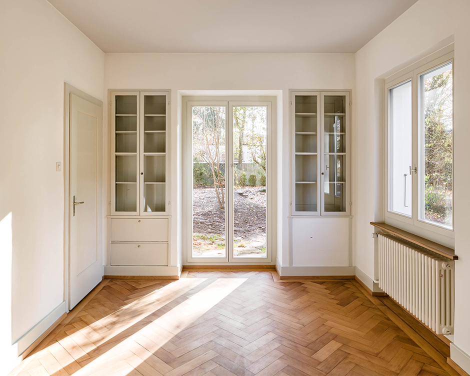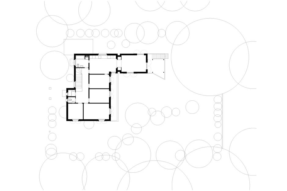 Der neue Gebäudeteil ragt tief in den Garten, bis an die Krone einer alten Rotbuche, hinein. Hier löst sich die klare Volumetrie mit Terrasse und Aussentreppe auf und erweckt beinahe den Eindruck, man sitze in einem Baumhaus. Bestehende Fensteröffnungen wurden zu Durchgängen ausgebaut. Dabei ist der gesamte Neubau um die Höhe einer Stufe versetzt. Bei jedem Durchgang von Alt zu Neu lässt diese Schwelle den Übergang bewusst werden. Im Detail greift der Anbau viele Themen des Bestandes auf. So finden sich etwa die sorgfältig eingebauten Apothekerschränke als zeitgenössische Variante beim Innenausbau wieder.