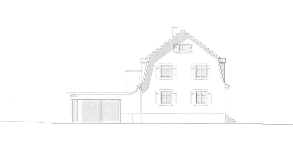 Architektonisch leitet sich die Dachform der Erweiterung vom bestehenden Mansardengiebeldach des Hauses ab. Die Rundung zur Traufe wird aufgegriffen und die Linie des Daches mit dem Anbau weitergeführt.